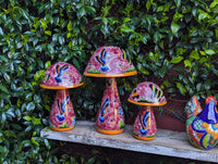 Step into a world of whimsy and wonder with our vibrant and captivating Talavera Toadstools. Skillfully painted and kiln-fired twice for longevity, each mushroom boasts a bold punch of festive, Mexican color, bringing joy and life to any yard or garden space. Embrace the magic of nature's beauty featuring hummingbirds and butterflies and invite a touch of enchantment into your home with these unique and delightful, handmade creations.