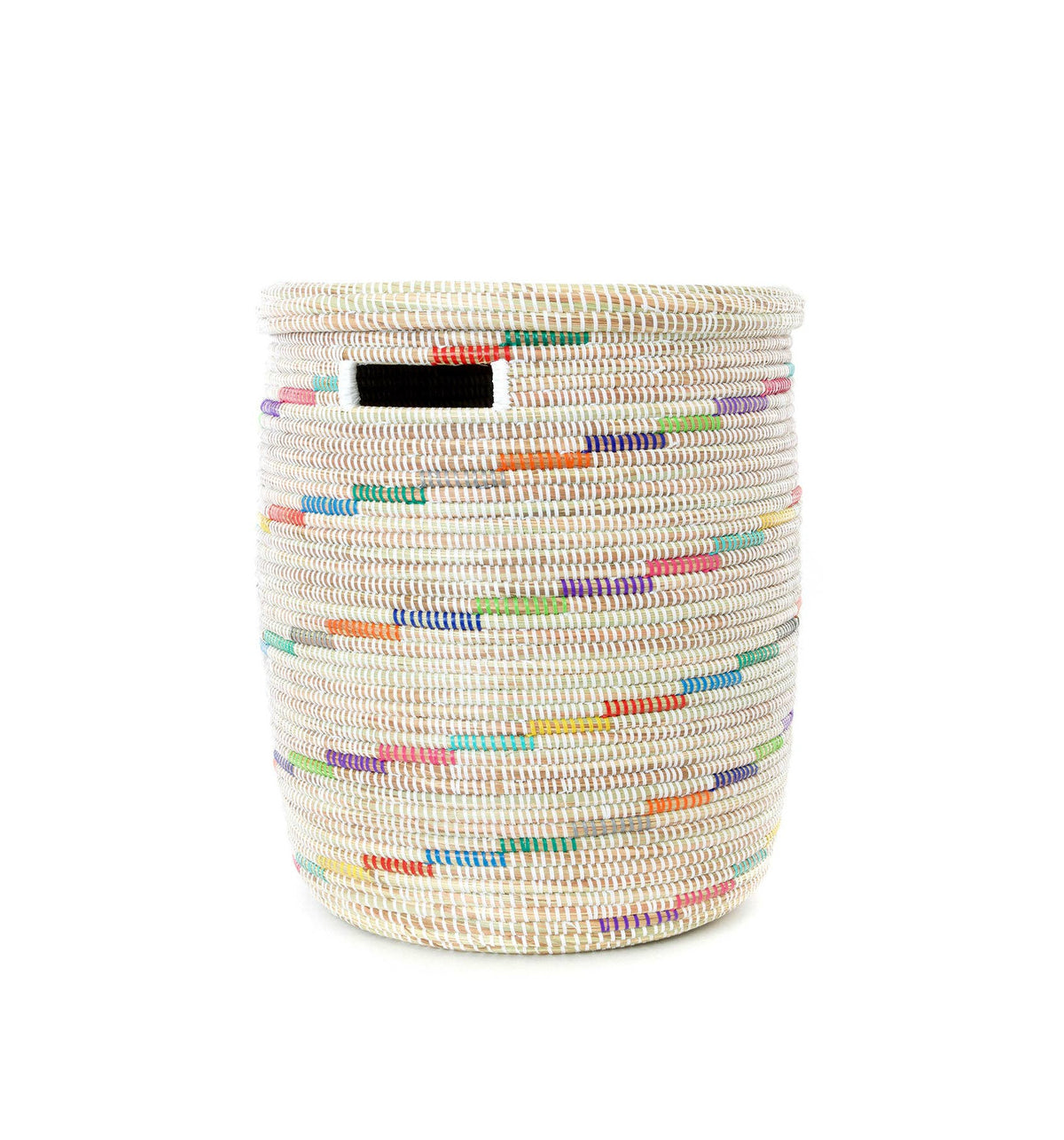 Wolof women in the West African nation of Senegal update traditional coil weaving methods by enlivening natural grass baskets with colorful strips of plastic salvaged from a mat factory. Cattails grow abundantly in rural Senegal, so women can earn a sustainable income from basket weaving while enriching homes around the world with modern African craftsmanship. This classic-style laundry hamper storage basket features an overlapping lid and cutout handles.