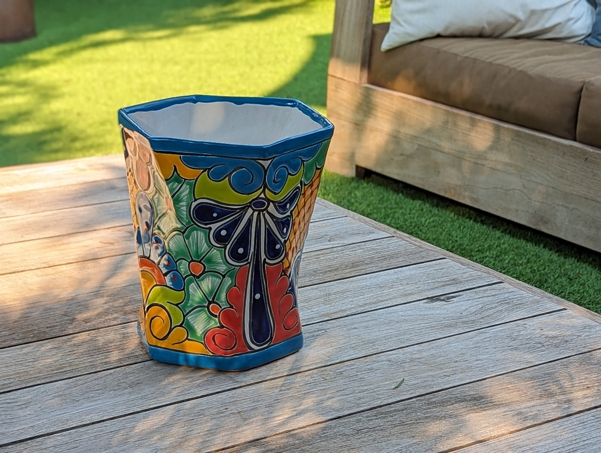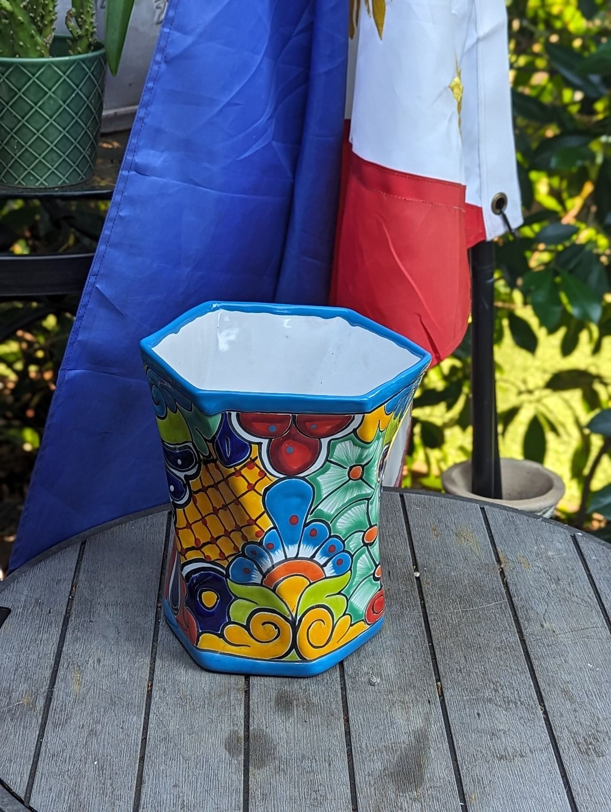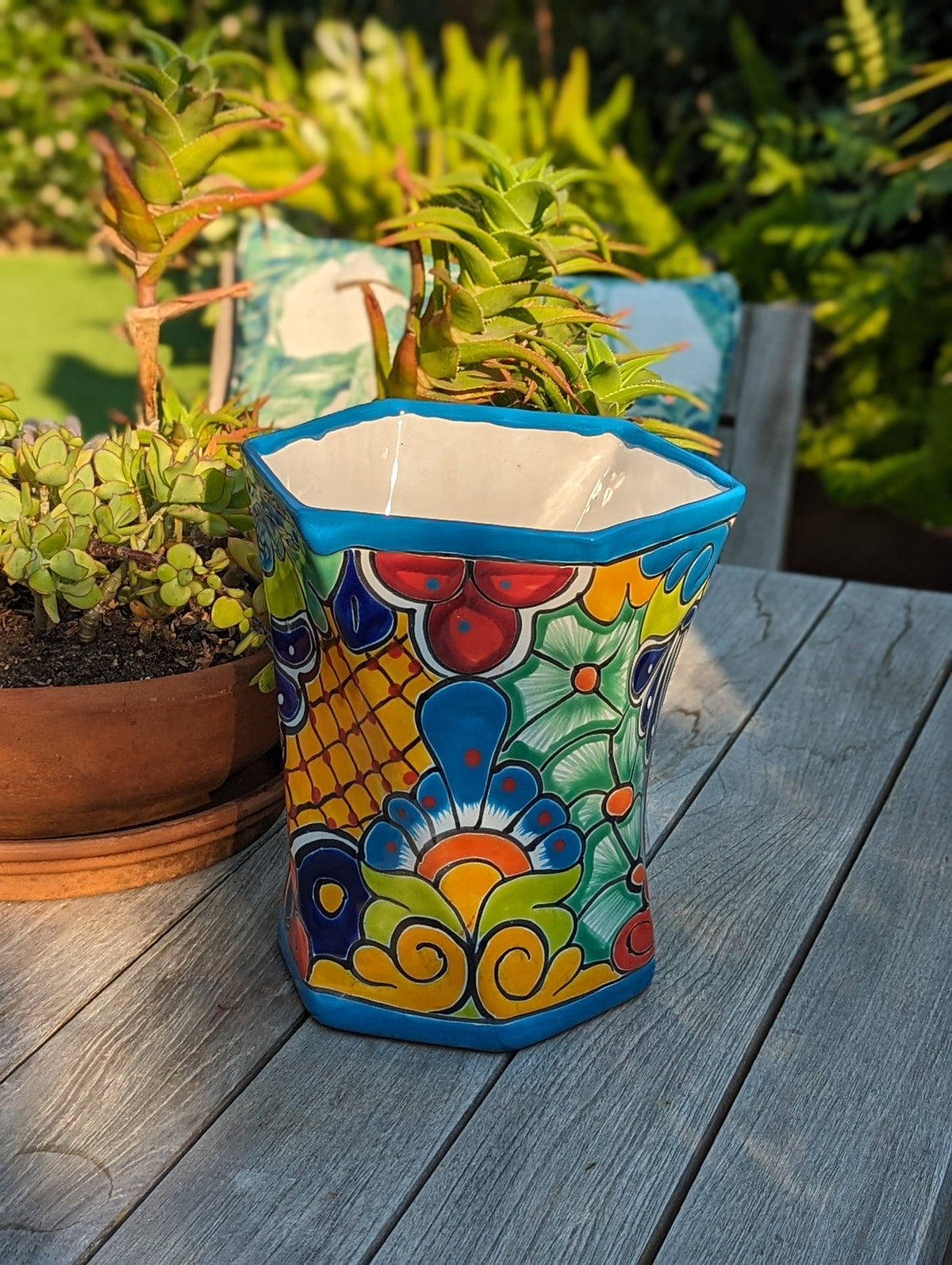 > A Large, Beautiful Hexagon and Talavera-style planter at 10.25" tall and 9.5" around.