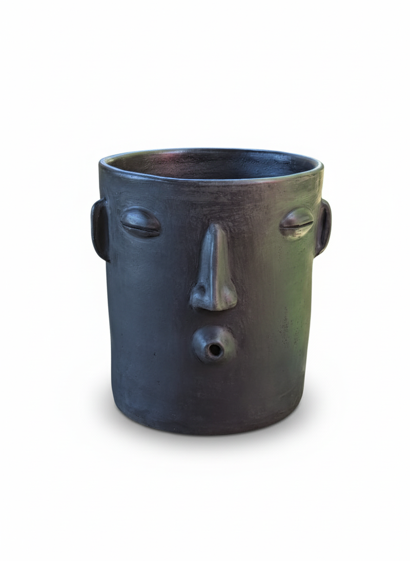 A brown ceramic cactus plant pot with a simplistic and rustic design, handmade Mexican pottery, displayed outdoors.
