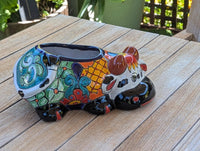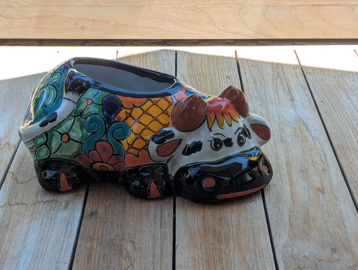 Introducing our charming Talavera Cow Planter adorned with cheerful and delightful fusion of bold nature colors and Mexican artistry. Handcrafted with meticulous attention to detail, this ceramic cow planter adds a big punch of color to your space while providing a perfect home for your favorite plants.